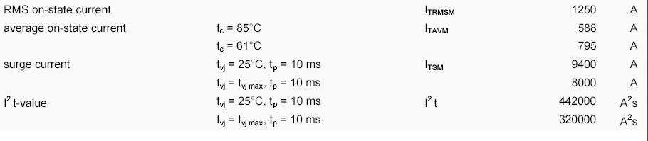 關(guān)鍵數(shù)據(jù)1:通態(tài)電流有效值1250A,與軟起動(dòng)器的額定輸出電流能力1290A近似相同;