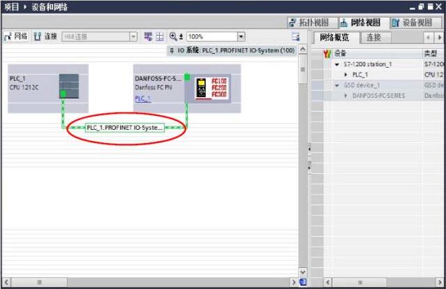 十、網絡配置:將丹佛斯變頻器加入到 ProfiNET 網絡總線上,點擊‘設備和網絡’-‘選 擇變頻器’-‘選擇 I/O 控制器’-‘PLC1_-PROFINET 接口_1’,如圖十一所示,配置完成 后,如圖十二所示: