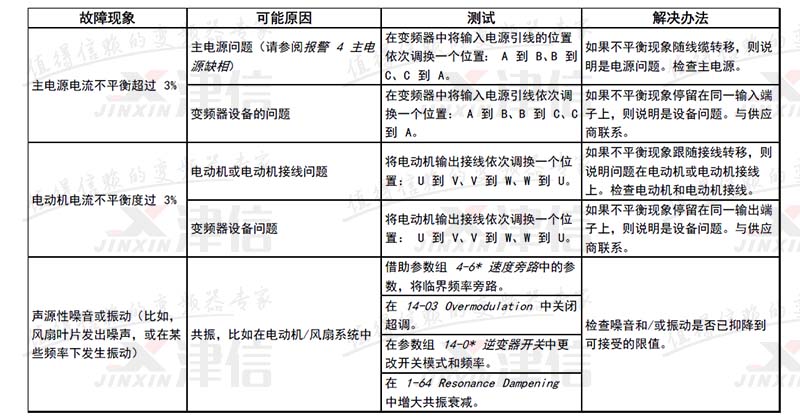 | 4 | 主電源缺相 1) | X | X | X | 供電側(cè)缺相,或電壓嚴(yán)重失衡。檢查供電電壓。 |