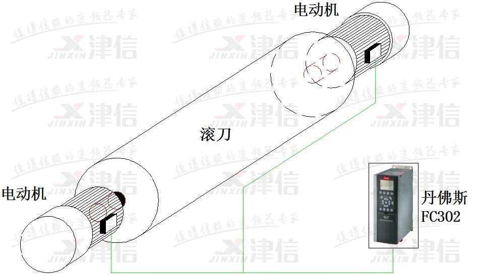 丹佛斯FC302變頻器通過磁通矢量控制同時驅動兩臺異步伺服電機,保證在飛剪同步的過程中滾刀兩電機輸出轉速和轉矩一致。在選型和調試時只要將電機的功率和電機的電流相加即可,這樣就可以只通過丹佛斯FC302變頻器來實現剛性連接的兩個電機同步。