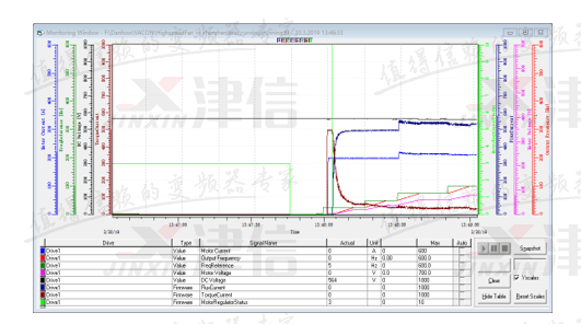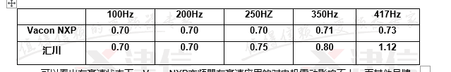 可以看出在高速狀態(tài)下,VaconNXP變頻器在高速應(yīng)用的對電機震動影響不大,而其他品牌變頻器在高速應(yīng)用時,會增加電機震動。高速應(yīng)用在Vacon變頻器有完整的解決方案,NXP系列變頻器完全可以穩(wěn)定應(yīng)用在高速應(yīng)用的場合,同時有良好的應(yīng)用效果。