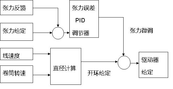 由于采用以上技術(shù)方案,使得排線平整,進而使收線伺服的控制是典型的中心卷繞控制。中心卷繞控制原理框圖如圖3所示。根據(jù)收線伺服當前實際轉(zhuǎn)速計算需要的開環(huán)給定量,同時通過跳舞輪反饋引入張力調(diào)節(jié),最終確定收線伺服驅(qū)動器的給定量。