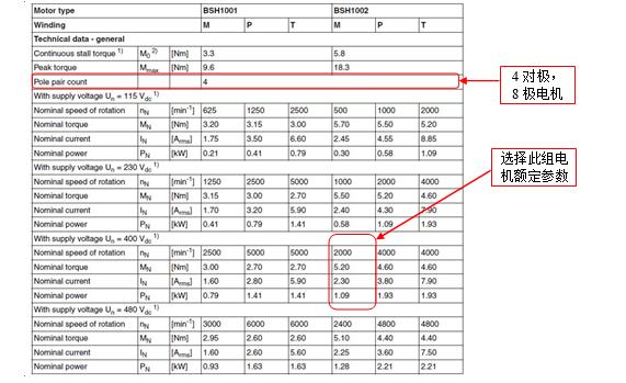 380V驅動器內部直流電壓約530V,考慮20%欲量,應選擇400Vdc選此組電機額定參數,因此得到電機額定電流2.30A、額定轉速2000rpm、額定轉矩5.20Nm和電機極數8極。